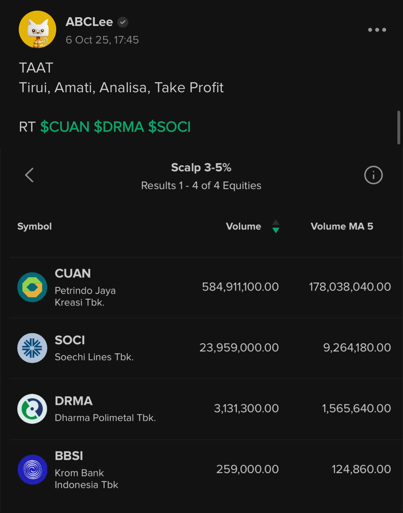✅ Cocok Untuk: Cocok untuk swing batch kecil dan scalping, tidak untuk trend-follower besar tanpa news, best diakumulasi bertahap saat base sideways.