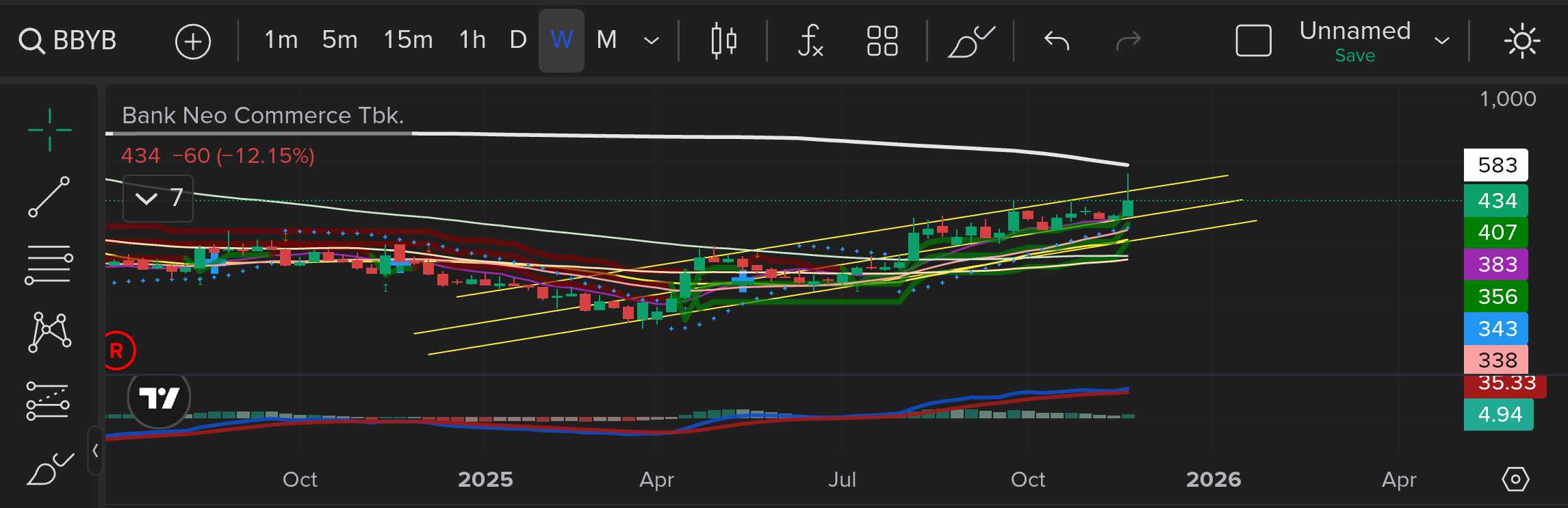 $BBYB jika harga saat ini 434 dengan PBV saat ini 1,4 maka target selanjutnya dengan metode PBV valuasi akan kearah 659 diarea ma50 monthly #disclaimer
