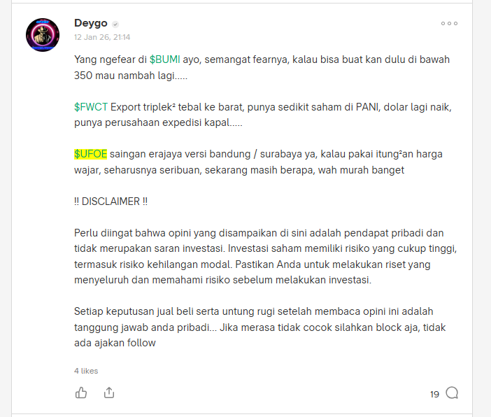 > Setiap investor diharapkan melakukan analisis mandiri (do your own research) dan menyesuaikan keputusan investasi dengan tujuan, profil risiko, serta kondisi keuangan pribadi.