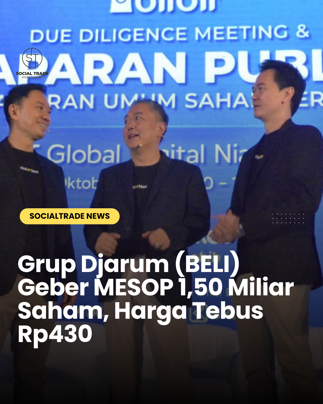 Emiten e-commerce Grup Djarum, PT Global Digital Niaga Tbk (BELI) melanjutkan program insentif saham melalui MESOP III Tahap IV dan MESOP IV Tahap II. Periode pelaksanaan berlangsung 15 Maret–13 April 2026 dengan harga tebus Rp430 per saham. Total hak opsi yang dapat dieksekusi mencapai 1,5 miliar saham.