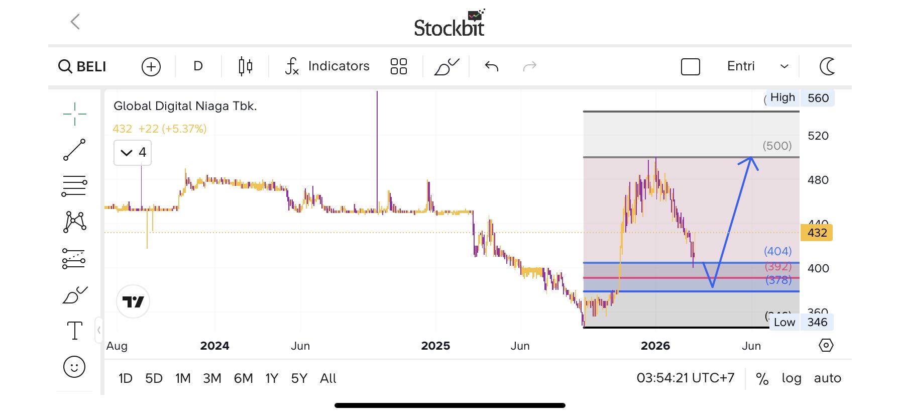 - Entry: Buy kalau breakout > 600 dengan volume besar