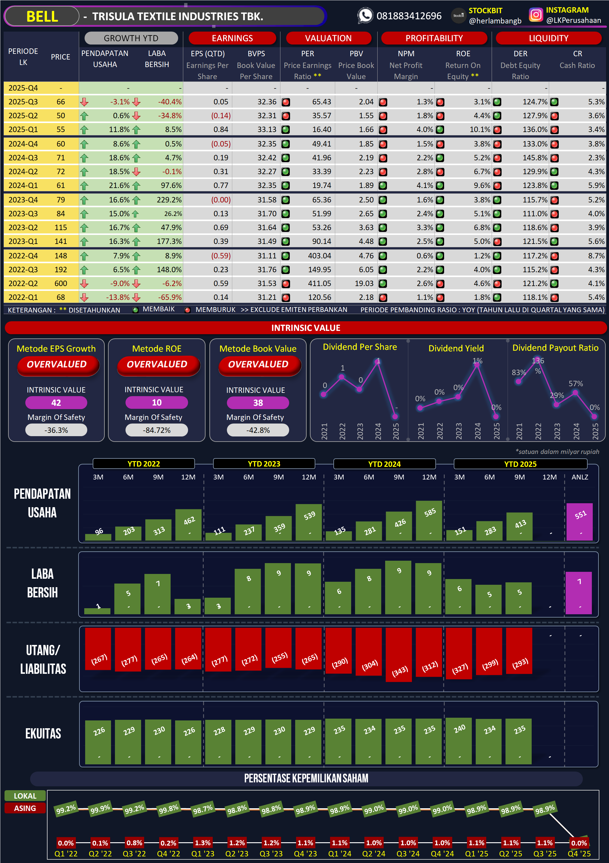 Ruang lingkup kegiatan PT Trisula Textile Industries Tbk adalah bergerak dalam bidang perdagangan pakaian jadi (garmen),industri garmen,industri tekstil,serta produk lainnya yang serupa. Produk utama yang dihasilkan oleh BELL yaitu polyester, Polyester Rayon,Polyester Cotton dan Corporate Uniform.