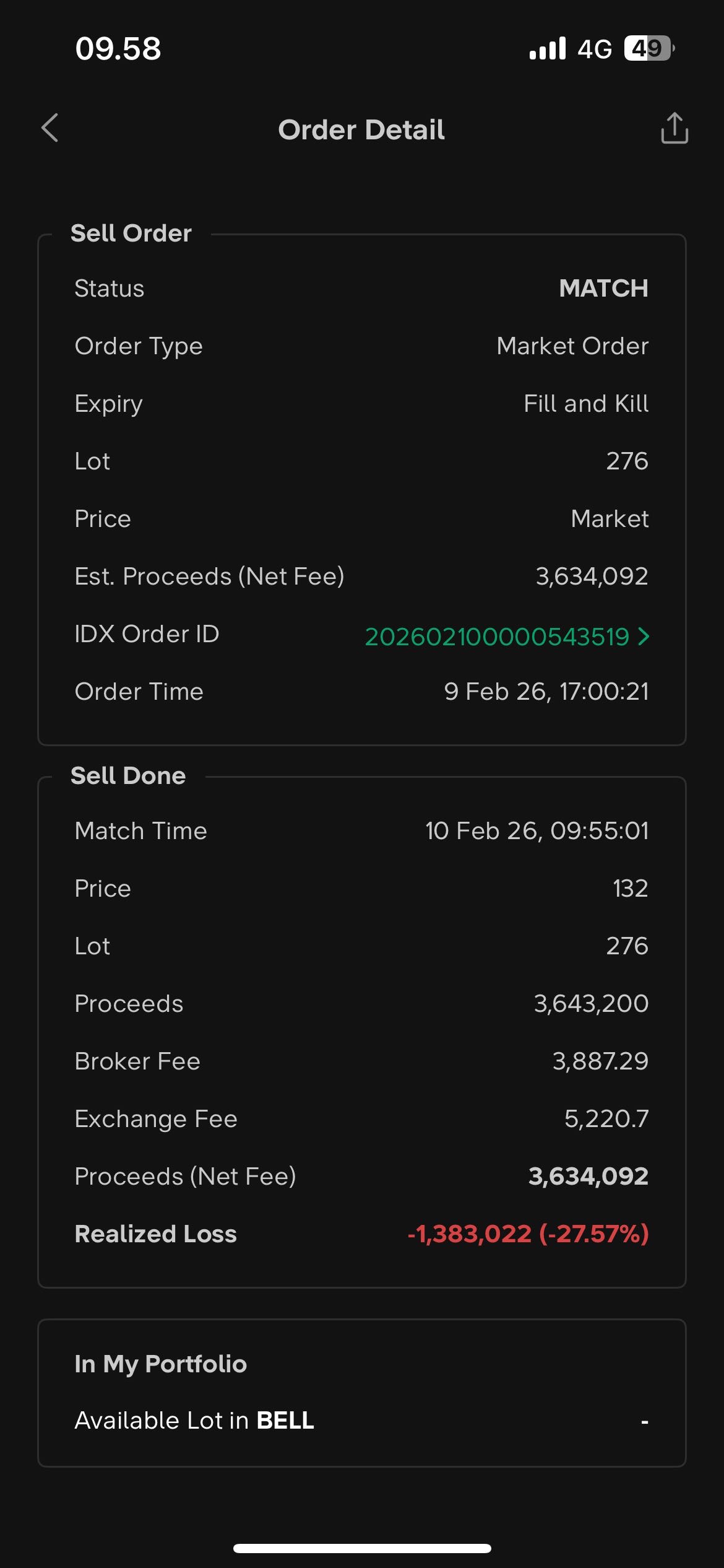 $BELL yg haka di pucuk harga 180-199 tgl 21 januari kemarin langsung disuspend seminggu lebih, abis itu fca gk bisa jual, gmna ngatur money management nya klo gini, gk bsa cut loss, ruginya gk bisa dikontrol, BEI kampret.