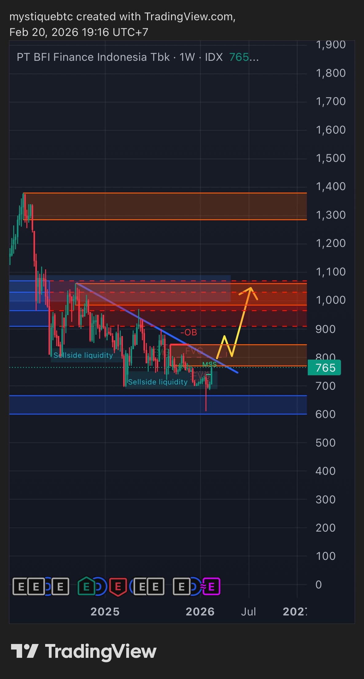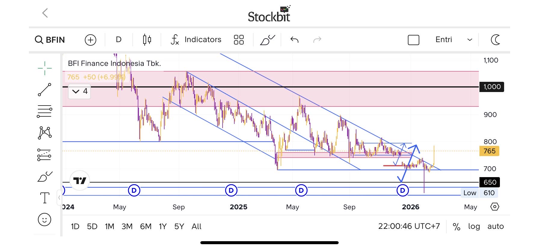 Bisa naik sampai berapa dan apakah sinyal perlawanan naik ini bisa menjadi sinyal dari sudah selesainya tren turun harga saham $BFIN yang sudah berjalan dari tahun lalu?