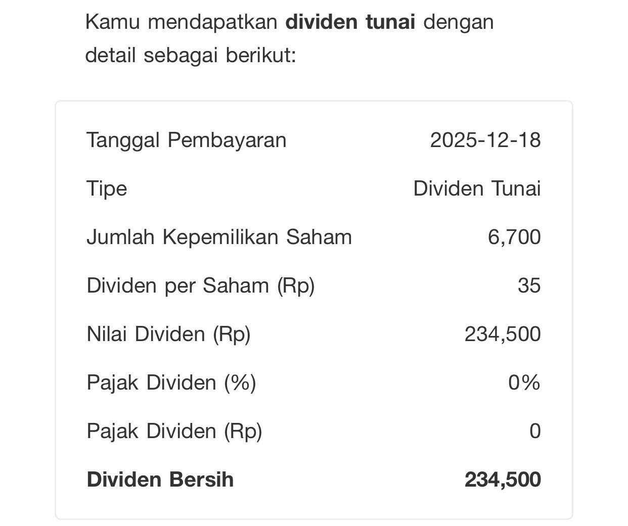 (+) Dividen interim Rp35/saham dibayar hari ini 18 Desember 2025, dividend yield ~4.93% attractive untuk income investorβ
