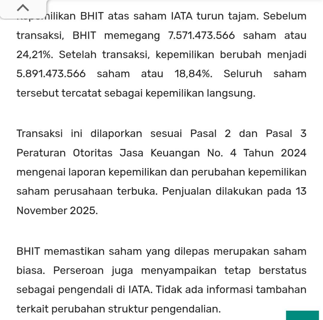 EBuzz โ PT MNC Asia Holding Tbk (BHIT) menjual 1.680.000.000 (5,37%) saham anak usahanya, PT MNC Energy Investments Tbk (IATA). Penjualan saham dilakukan pada 13 November 2025.