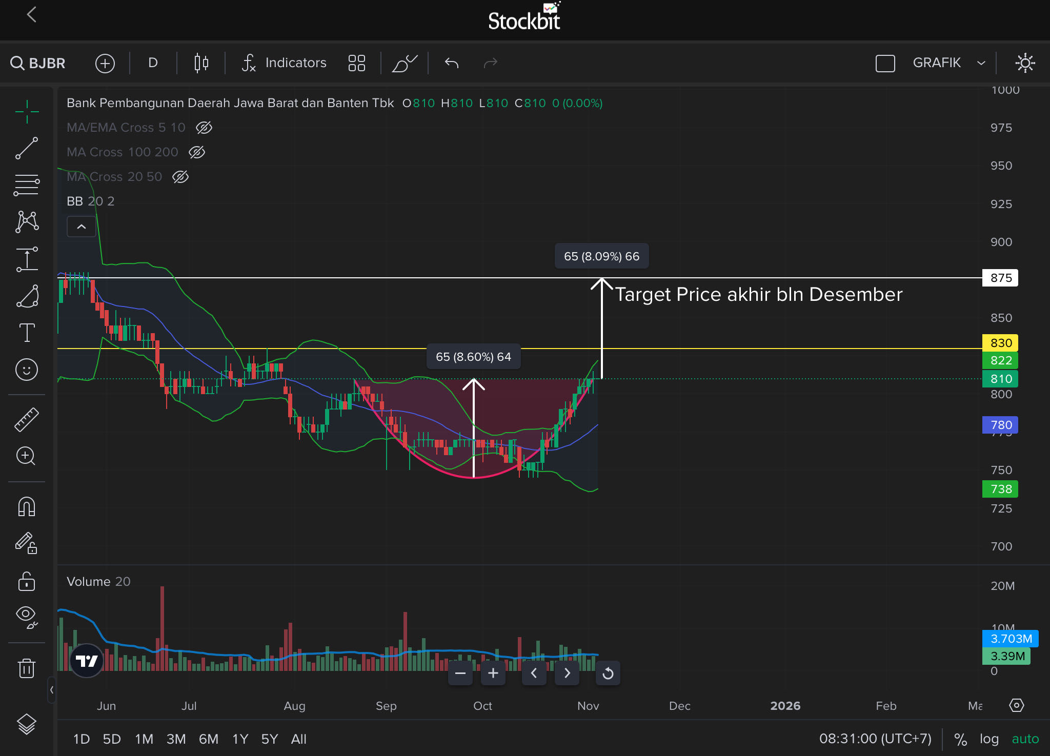 Saham $BJBR hari ini berada di harga 815, analisa saya saham BJB akan tembus mencapai harga 1000 dalam beberapa bulan ke depan. Beberapa faktor yang mungkin mempengaruhi harga saham BJB ini adalah: