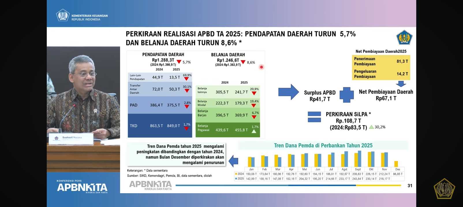 SILPA (lebih anggaran/kas daerah yang tidak terpakai) tahun 2025 diperkirakan lebih dari Rp 100 triliun.