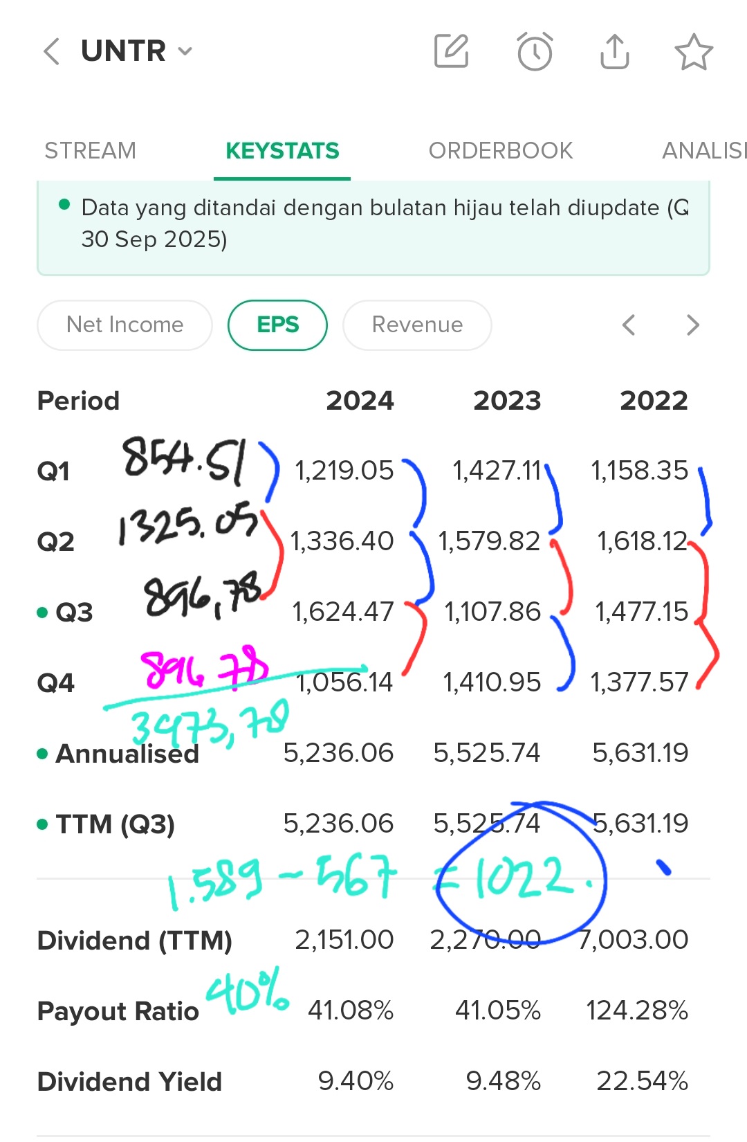 UNTR sudah mengumumkan kinerja Q3 2025 dengan EPS sebesar 896.78 Rupiah