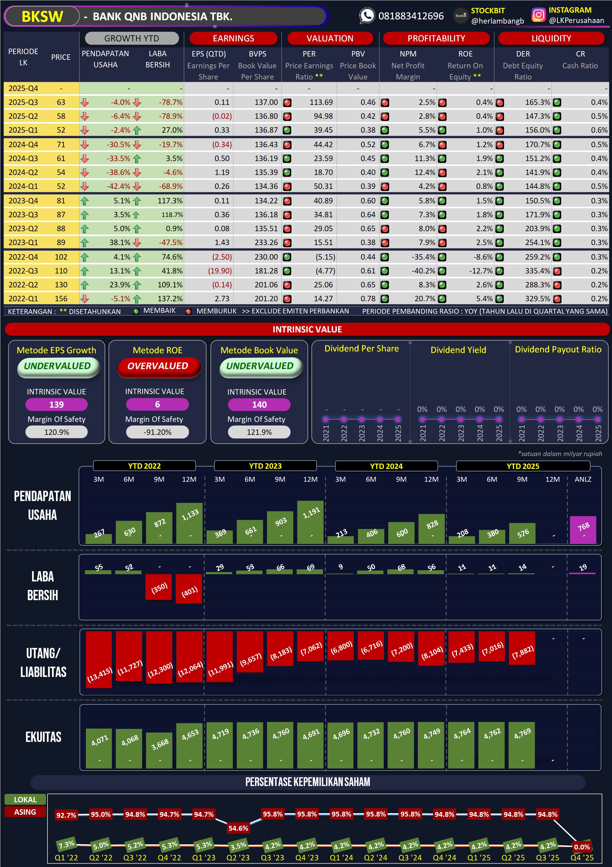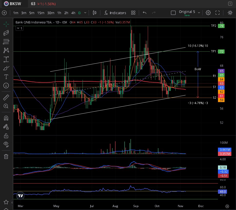 PT Bank QNB Indonesia Tbk. atau BKSW (d/h PT Bank QNB Kesawan Tbk merupakan perusahaan yang bergerak dalam bidang usaha Jasa Perbankan, Bank Devisa dan Bank Persepsi Kas Negara. Perseroan telah memiliki 46 jaringan kantor yang tersebar di wilayah Indonesia. Produk dan jasa Perseroan diantaranya Simpanan, Pinjaman, dan Produk lainnya.1 (satu) kantor pusat,16 (enam belas) kantor cabang,32 (tiga puluh dua) kantor cabang pembantu,68 (enam puluh delapan) ATM.