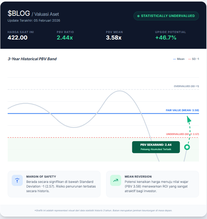 Secara statistik, BLOG berada dalam zona "Discount". Dengan skor valuasi yang solid, potensi pembalikan harga (rebound) menuju nilai wajar (PBV 3.58) tetap terbuka lebar. Investor disarankan untuk memverifikasi kualitas aset dan keberlanjutan laba untuk memastikan bahwa rendahnya valuasi ini bukan merupakan "Value Trap" (jebakan nilai).
