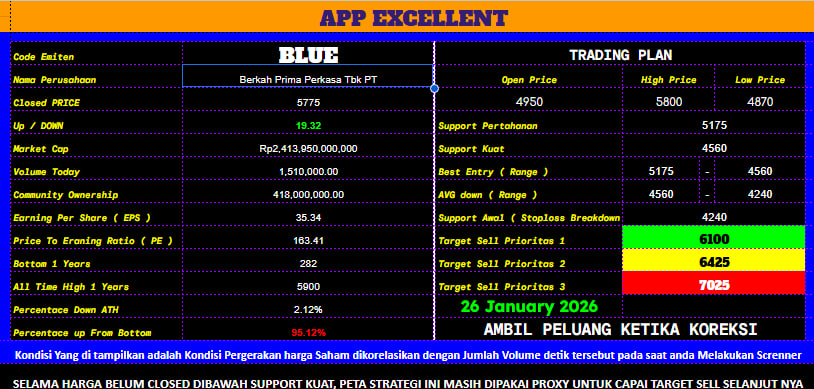 - Selama BLUE mampu bertahan di atas support kunci 5.000, peluang teknikal ke area 6.100ā6.500 masih terbuka.
