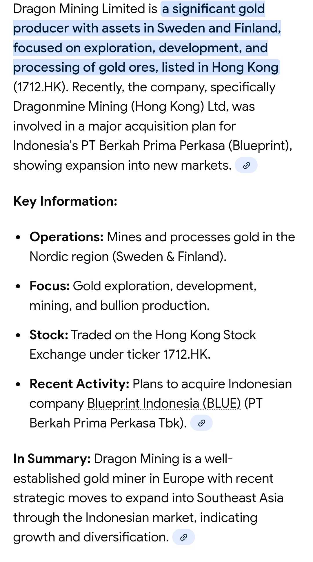 Dragon Mining Limited adalah perusahaan tambang emas yang sudah mapan dengan operasi utama di Swedia dan Finlandia, fokus pada eksplorasi, pengembangan, dan produksi emas. Sahamnya tercatat di Bursa Hong Kong (https://cutt.ly/stsTwtZF). Saat ini, Dragon Mining menunjukkan langkah strategis untuk ekspansi ke Asia Tenggara melalui rencana akuisisi PT Berkah Prima Perkasa $BLUE di Indonesia, yang mencerminkan upaya diversifikasi dan pertumbuhan ke pasar baru.