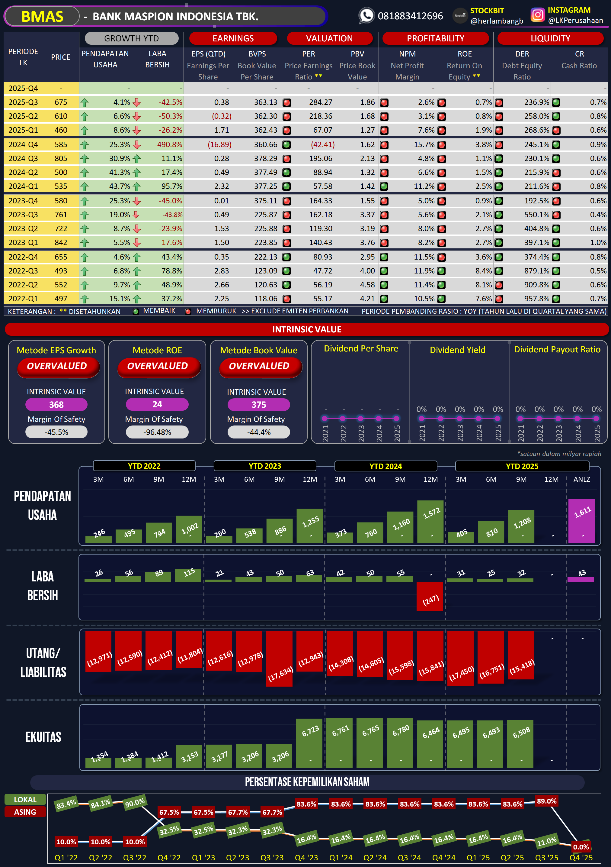 Untuk satu tahun ke depan, kinerja BMAS diperkirakan akan sejalan dengan indeks. Meskipun ada potensi pertumbuhan dari kepemilikan KBank Group dan peningkatan kapabilitas bank, tantangan profitabilitas (laba Q2 2025 yang tergerus) dan kondisi likuiditas ketat di sektor perbankan Indonesia secara keseluruhan dapat membatasi kenaikan harga saham. Outlook sektor perbankan yang 'cautiously optimistic' dengan potensi stagnasi pertumbuhan kredit di 2025 juga perlu dipertimbangkan.