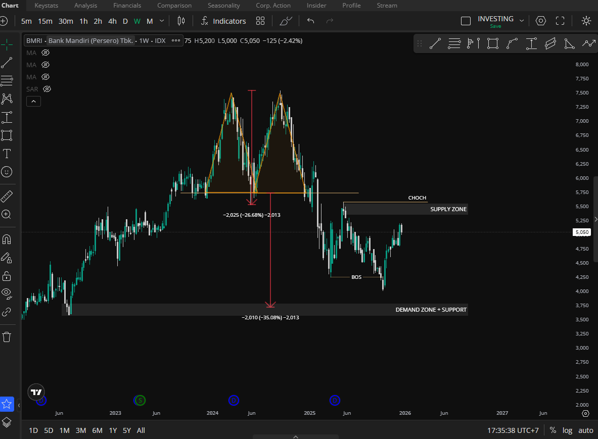 $BMRI LONG GAME. SELAMA BELUM MENCIPTAKAN HIGHER HIGH BARU BMRI BELUM TERKONFIRMASI BULLISH JANGKA PANJANG. PENURUNAN DOUBLE TOP MASIH BELUM SELESAI. DAN ALIRAN DANA ASING MASUK PUN BELUM KONSISTEN