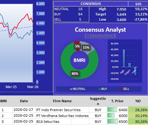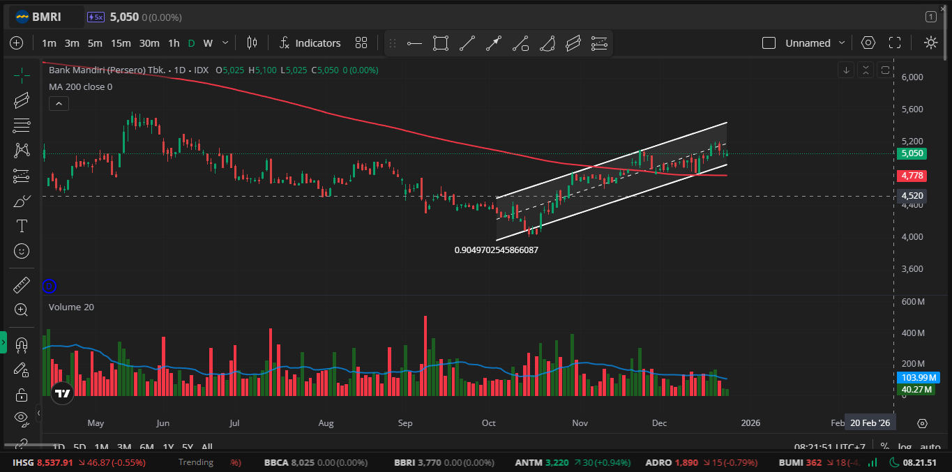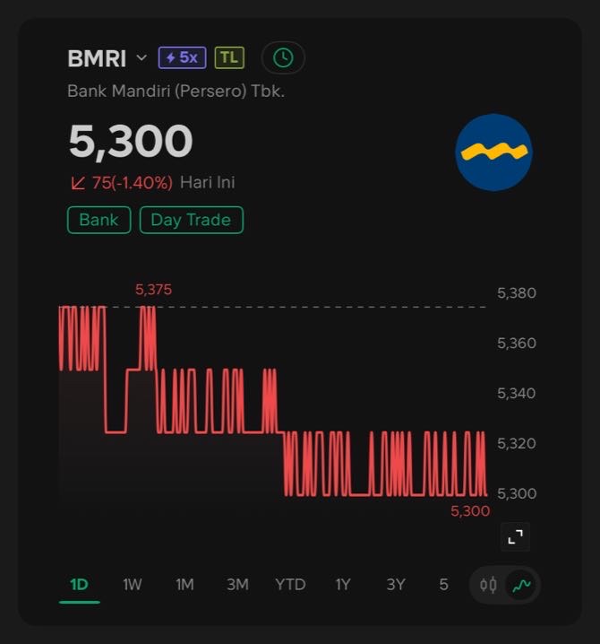 PT Bank Mandiri (Persero) Tbk. atau BMRI merupakan bank BUMN yang melakukan usaha di bidang perbankan. Entitas anak Perseroan diantaranya: PT Bank Syariah Mandiri (perbankkan syariah), Bank Mandiri (Europe) Limited (perbankan), PT Mandiri Sekuritas (Sekuritas), PT Bank Sinar Harapan Bali (perbankan), PT Mandiri Tunas Finance (pembiayaan konsumen), Mandiri Internasional Remittance Sendirian Berhad (layanan Remittance), PT Axa Mandiri Financial Service (Asuransi jiwa) dan PT Mandiri AXA General Insurance (Asuransi kerugian). Entitas asosiasi dan pengendalian bersama Perseroan: PT Kustodian Sentral Efek Indonesia (Lembaga Penyelesa... Read More
