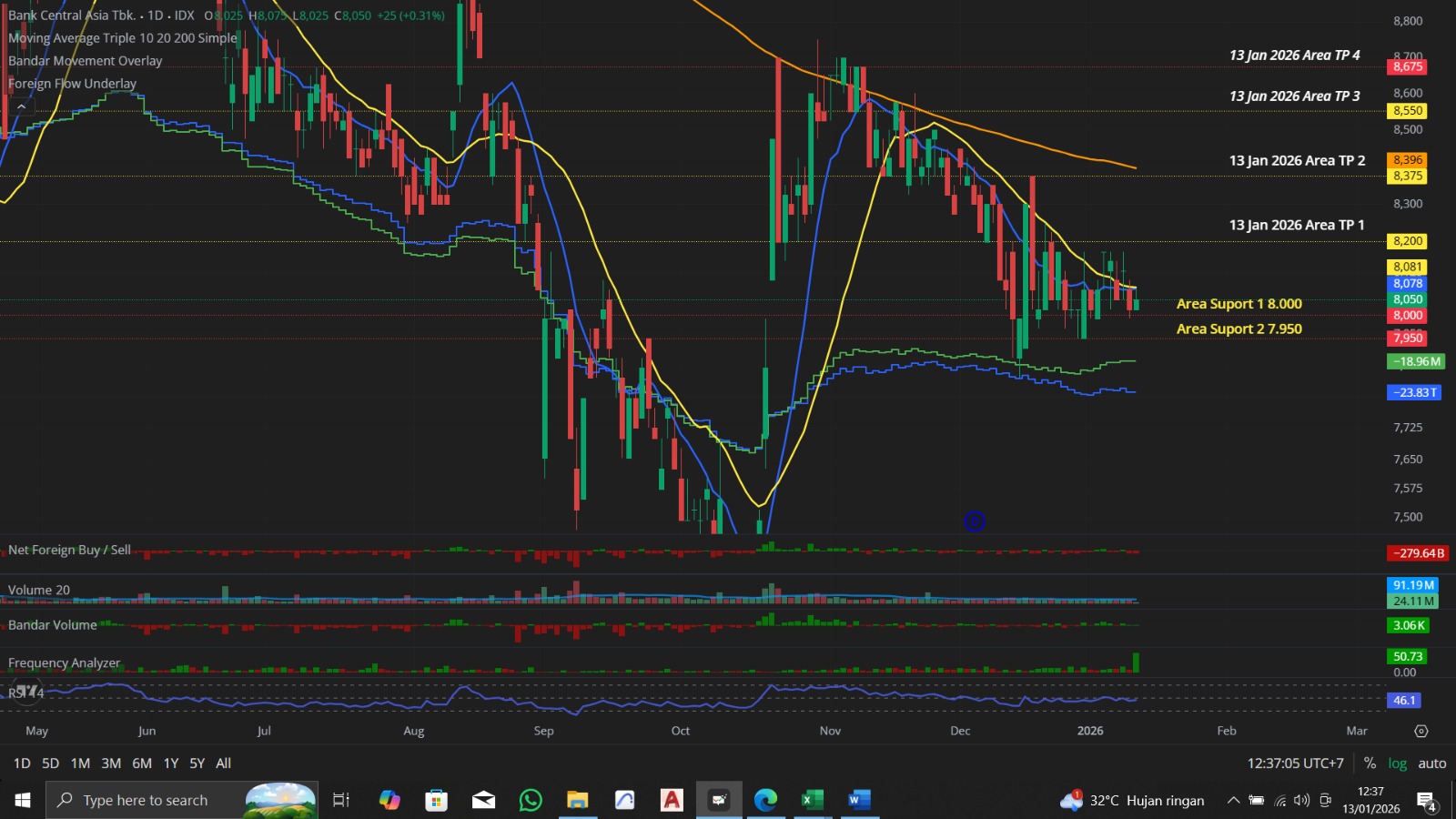 - Catatan : Harga bergerak konsolidasi setelah koreksi, membentuk base jangka pendek. Struktur belum uptrend penuh, namun peluang swing rebound terbuka selama support kunci bertahan.
