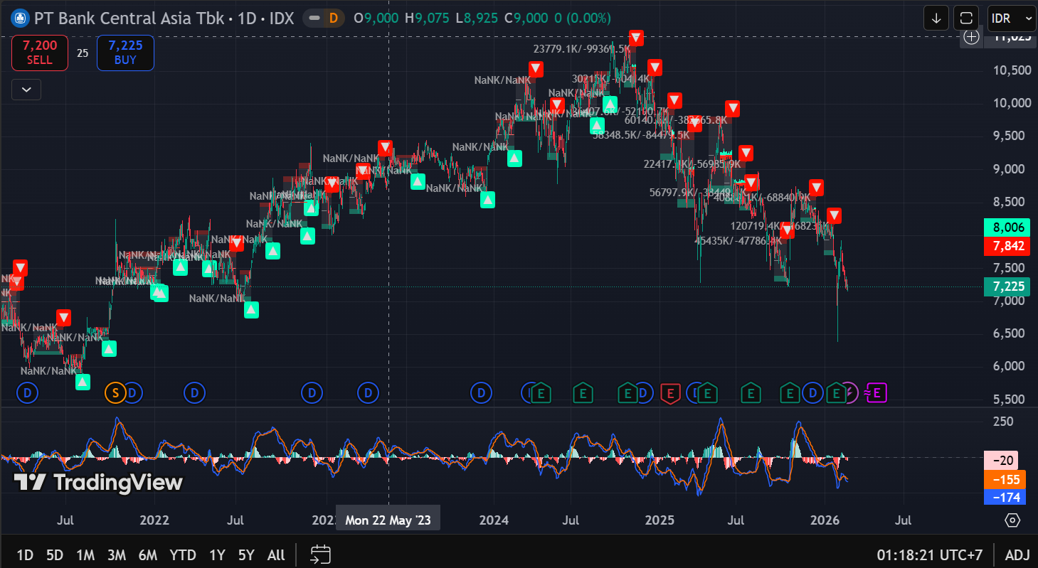 Harga saham BBCA sempat terkoreksi signifikan dari level tertingginya di awal tahun 2026. Secara teknikal, indikator Moving Average jangka pendek dan menengah memang sempat menunjukkan sinyal jual, namun indikator MACD Histogram berubah positif pada 10 Februari 2026, yang merupakan sebuah sinyal *bullish* kuat. Relative Strength Index (RSI) berada di posisi 44,97 yang tergolong netral namun mulai condong menuju area beli.