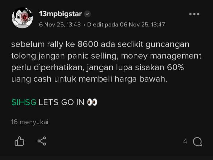 Intinya di semua saham 1, gausah beli di pucuk, beli pas sepi. Saham apapun kalau beli di pucuk + udah rame ga akan tenang.