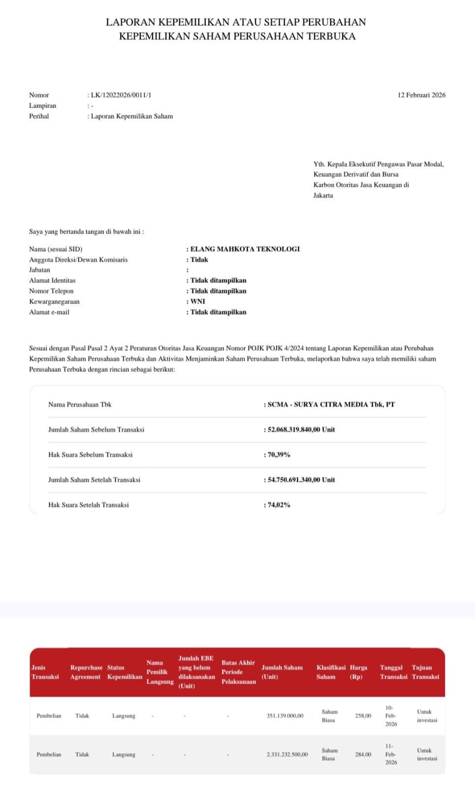 PT Elang Mahkota Teknologi EMTK menambah jumlah saham mereka di SCMA melalui dua kali transaksi pada Februari 2026:
