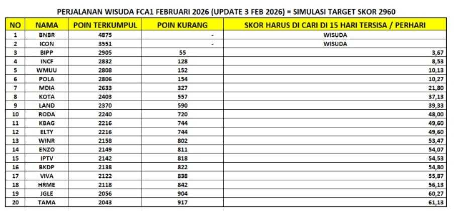 fyi,, meskipun poin akhir 2960 trcapai.. tapi jika harga closingan saham tsb di bawah <51 pada akhir evaluasi februari,, dia tetap tidak akan wisuda.