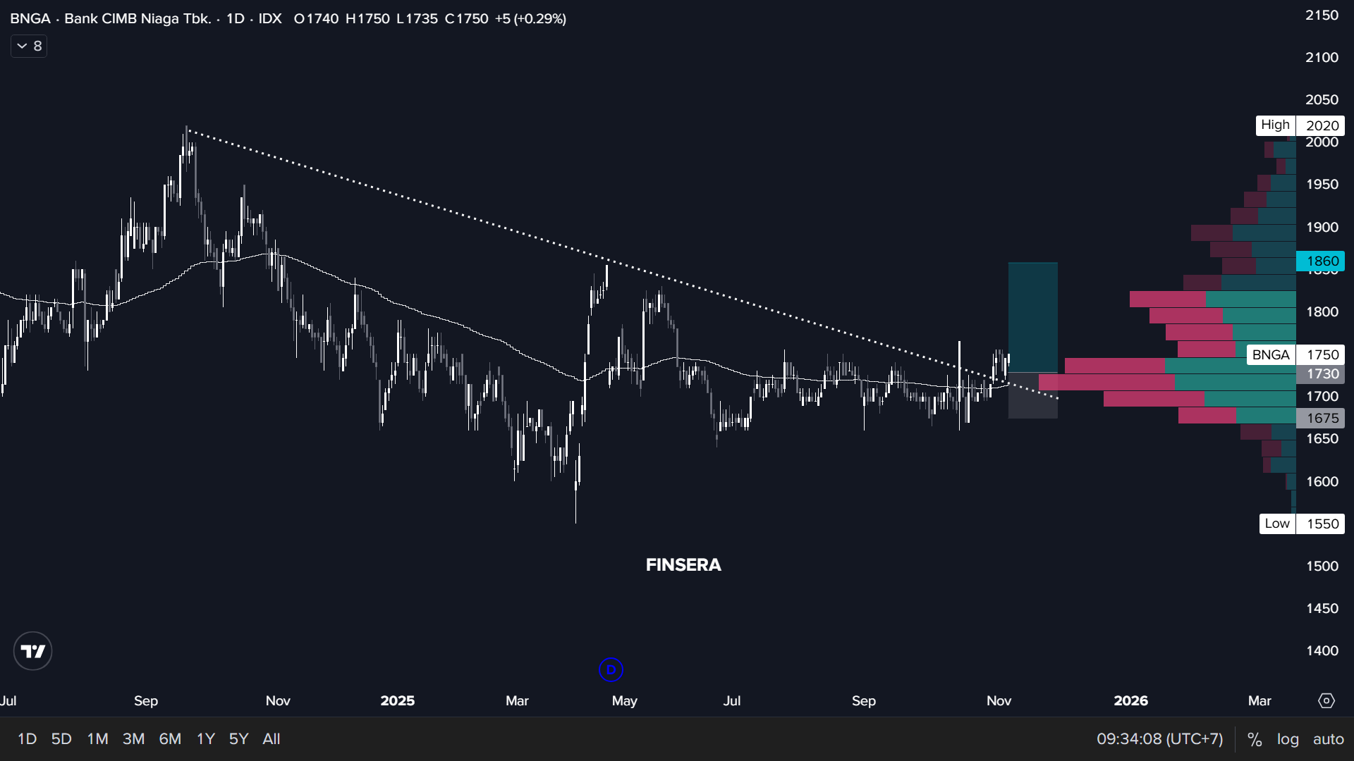 Harga akumulasi investor besar di Rp 1.695, dengan penutupan Rp 1.750 → ada potensi lanjutan tren naik jangka pendek jika akumulasi berlanjut.