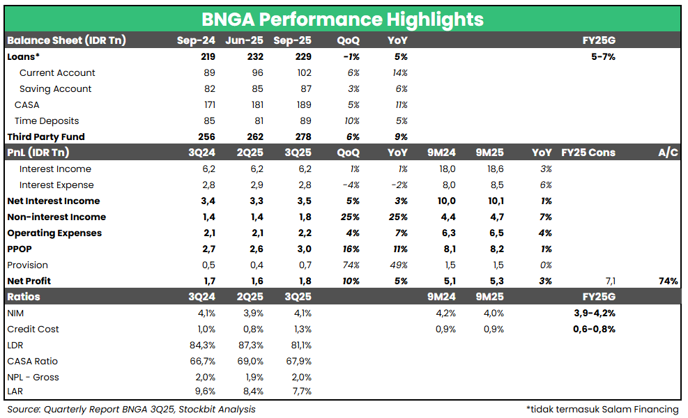 âȘïž Kinerja pada 3Q25 didukung oleh pulihnya Net Interest Margin (NIM) dan kenaikan NonâInterest Income (+25% YoY).