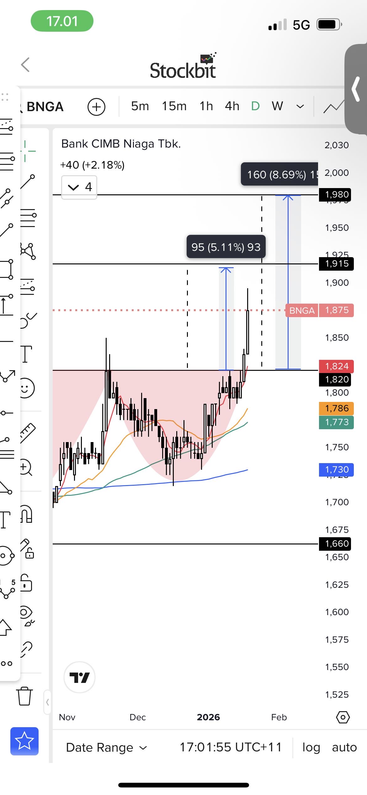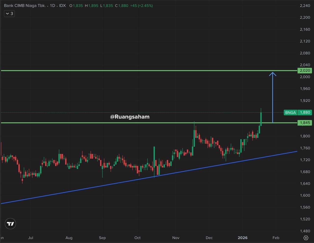 hari ini berhasil breakout dari resistance 1845 ya, maka BNGA berpotensi melanjutkan kenaikan ke area 2020 untuk tes resistance selanjutnya ! jika ada penurunan mendekati support 1845 bisa manfaatin masuk tapi jika turun dibawah 1800 wajib hindari saham ini ! good luck ! #BukanRekomendasi #AnalisaKembali #NoPomPom #DisclaimerOn #NFA #DYOR #BukanRekomendasi