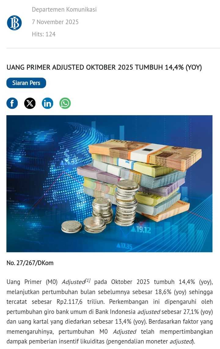 ➖ Uang Primer M0 Adjusted Indonesia tumbuh +14,4% yoy pada Okt 2025.