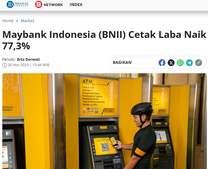 PT Bank Maybank Indonesia Tbk ( $BNII) membukukan laba setelah pajak dan kepentingan nonpengendali (PATAMI) meningkat 77,3% menjadi Rp 989 miliar hingga kuartal III-2025.