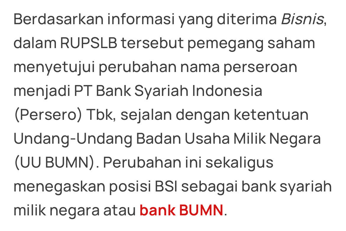 “Dengan demikian, BSI kini sejajar dengan keempat bank pelat merah tersebut, dan statusnya bukan lagi anak usaha BUMN. Seperti diketahui, BSI terbentuk dari konsolidasi ketiga entitas syariah milik Bank Mandiri, BNI, dan BRI..”
