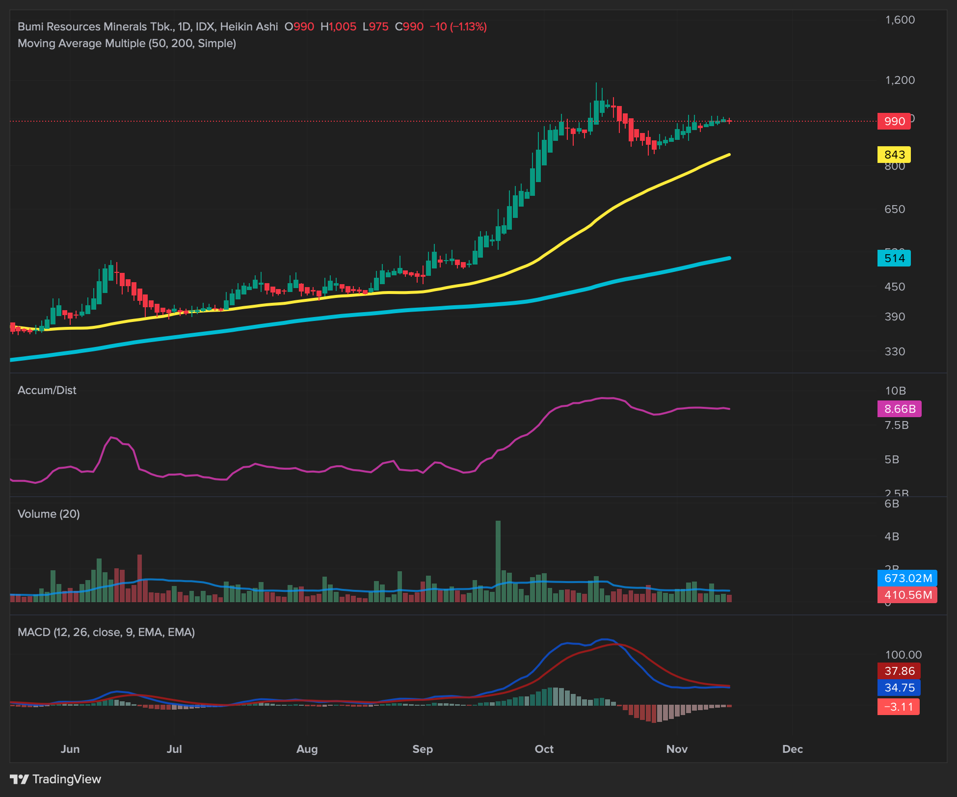 BRMS ini ada kisaran area Support diangka 940-965 yg terdekat, ada kemungkinan BRMS ini bisa koreksi menguji kisaran area Support tersebut dahulu kedepannya. Jika BRMS ini mampu untuk bisa terus bertahan diatas area Support tersebut yaitu 940-965, BRMS ini at the end masih besar potensinya untuk bisa balik naik menguji area Resistance Kuatnya Kembali yang ada diangka 1000-1020, Namun Jika BRMS ini gagal untuk bisa bertahan diatas area Supportnya n malah jebol dari 940nya, BRMS ini aku lihat ada potensi kedepannya bisa turun lebih dalam menuju Support Kuat berikutnya yang ada didekat" kisaran angka 900.