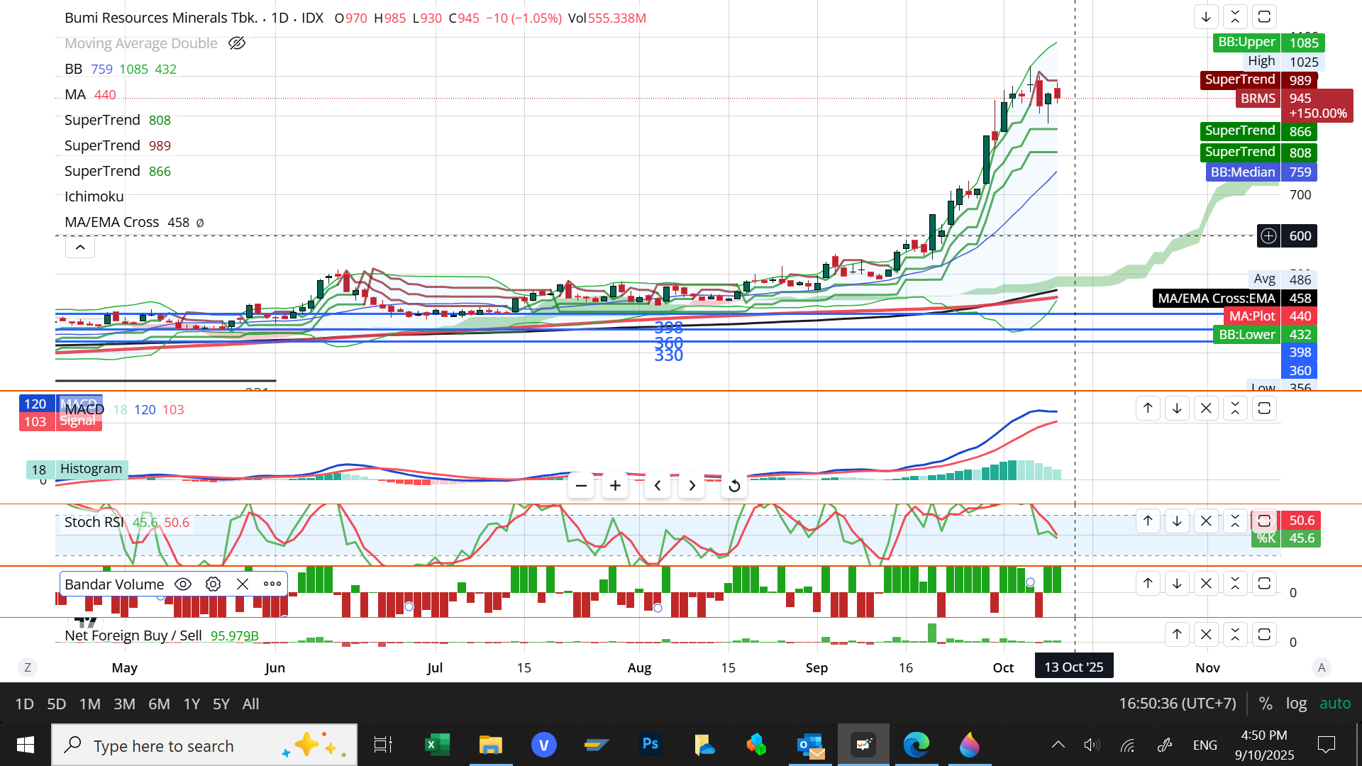 > BRMS masih dalam tren naik kuat. Selama gak jebol support 900, peluang lanjut naik tetap terbuka. Potensi cuan tetap menarik, tapi tetap waspada kalau volume tiba-tiba melemah.
