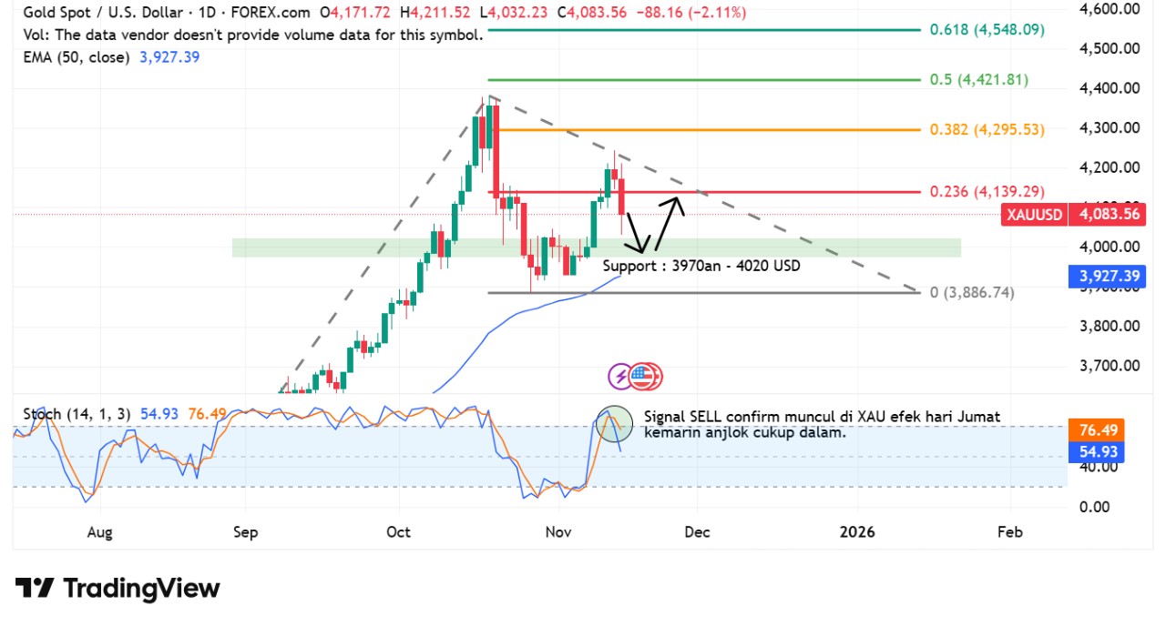 XAU overall technicalnya saat ini terlihat jadi kurang begitu menarik Kembali efek XAU di hari Jumat kemarin terkoreksi cukup dalam sekitar 2%an hingga saat ini berada diangka 4083 USD dimana terlihat ada muncul Signal SELL dari indicator stochasticnya, hal ini menunjukkan bahwa momentum Bullish yg sebelumnya ada sudah berakhir n ada potensi kedepannya dalam jangka pendek-menengahnya XAU ini akan bisa lanjut terkoreksi atau mentok" sideways.
