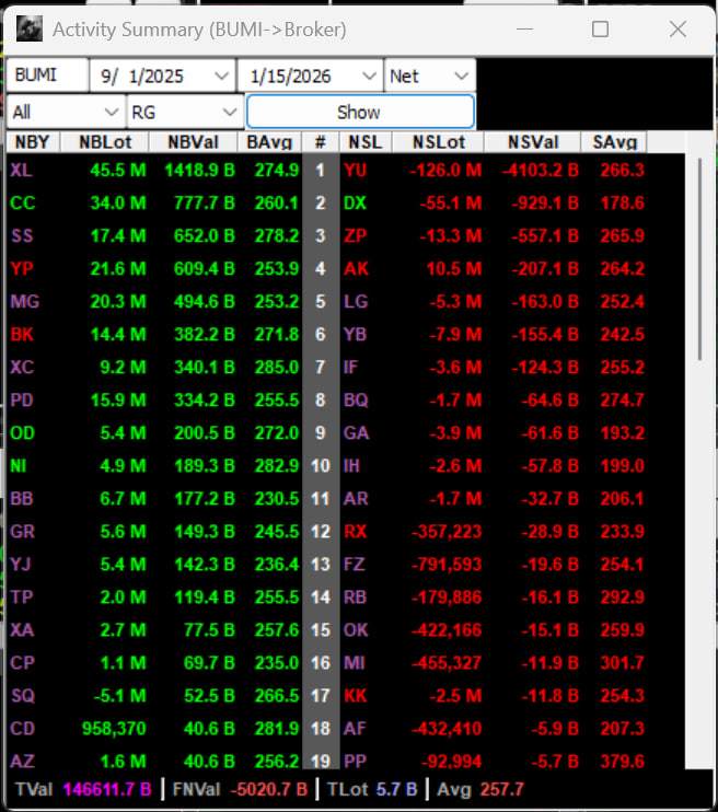 Lo liat screenshot data broker di atas? Broker YU (broker asing) udah net sell -126 juta lot senilai -410 miliar dalam sehari! Ini bukan angka main-main guys! Dan ini cuma dalam SEHARI aja! Kalo lo akumulasi dari awal hype MSCI sampe sekarang, total asing udah kabur sekitar 4 TRILIUN dari BUMI! Pertanyaannya: KENAPA MEREKA KABUR KALO EMANG BUMI MAU MASUK MSCI?!