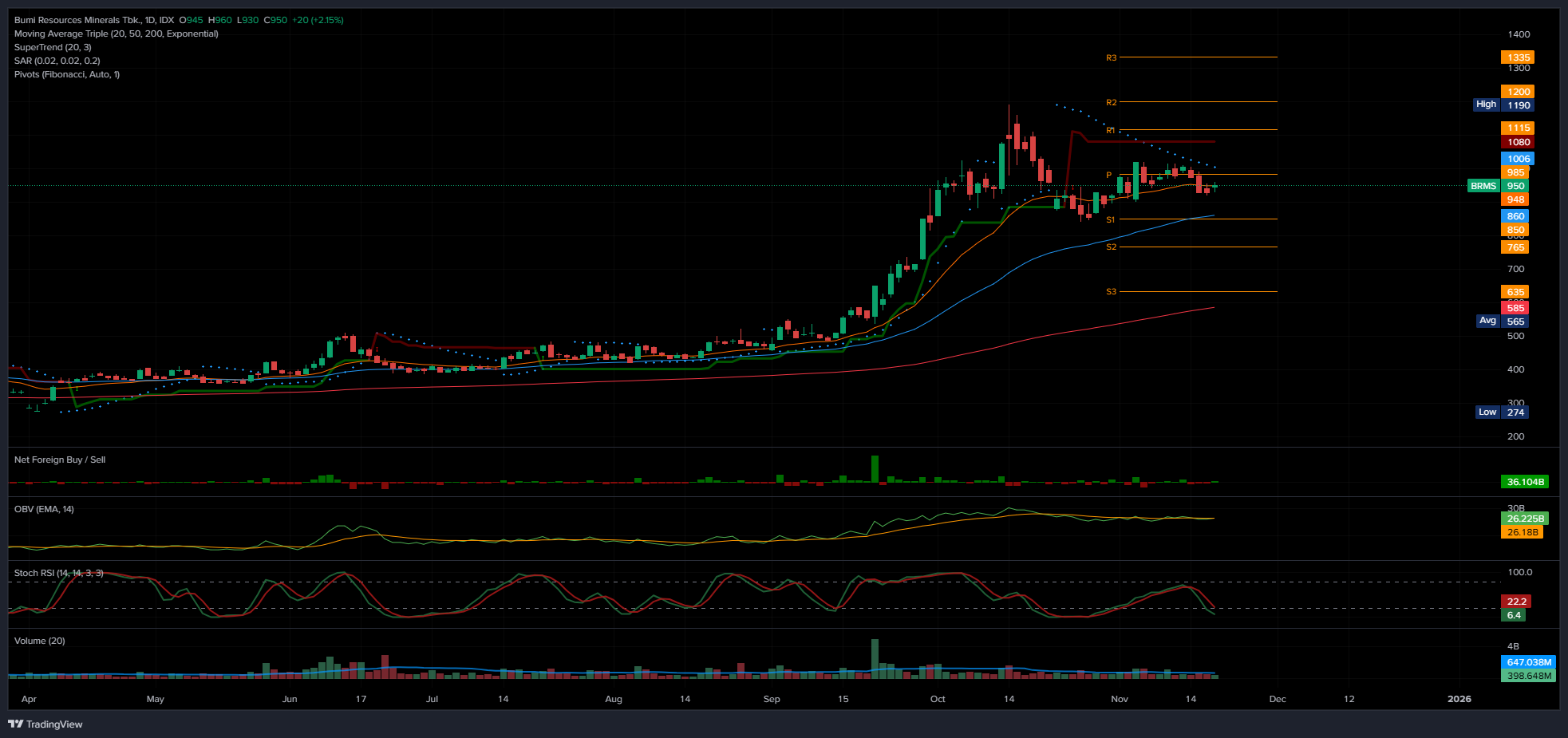 Katalis Positif: Sektor Energi/Grup Barito masih menarik perhatian pasar. Potensi technical rebound setelah penurunan signifikan (Daily RSI 45.8).