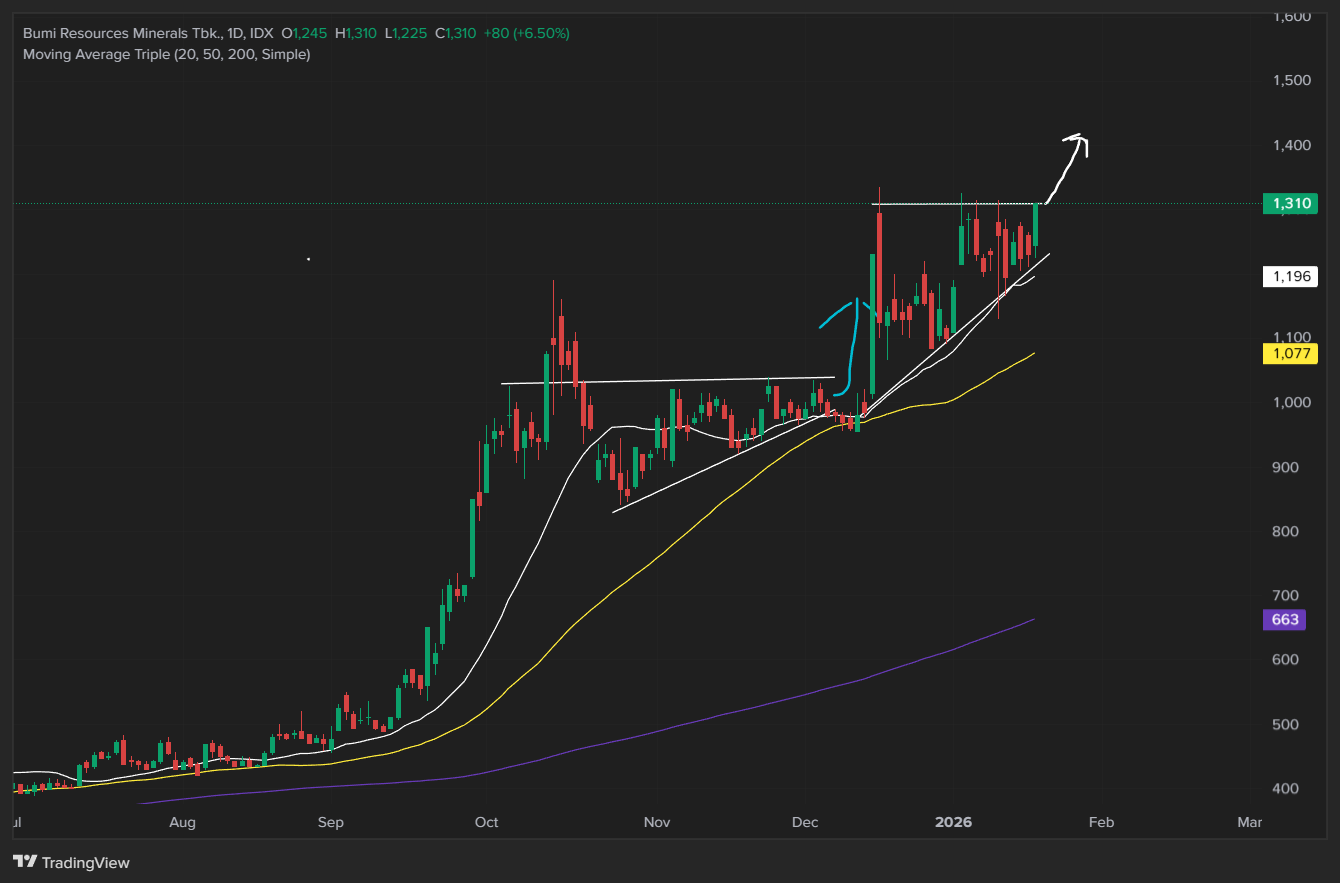 BRMS ini secara trend maupun momentum pergerakannya juga overall terlihat masih berada didalam posisi yang Strong Bullish saat ini sehingga semestinya BRMS berpotensi sangat besar kedepannya bakalan bisa lanjut naik dengan Target terdekat ada diangka 1335, lalu Nextnya jika memang BRMS ini kuat untuk bisa terus naik n BreakOut dari Target 1335nya tersebut, BRMS punya Next Target ada dikisaran angka 1475-1500. Adapun area Support untuk BRMS saat ini ada dikisaran angka 1275-1295 yg terdekat.