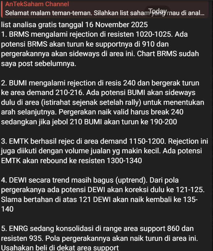 list analisa gratis malam ini tgl 16 November 2025. Ada $BRMS BUMI EMTK $DEWI ENRG . Khusus stockbit saya berikan kuota 3 lagi. Boleh komen dengan format : $BUMI
