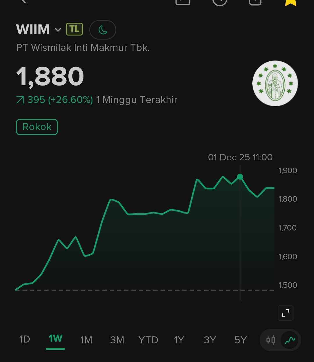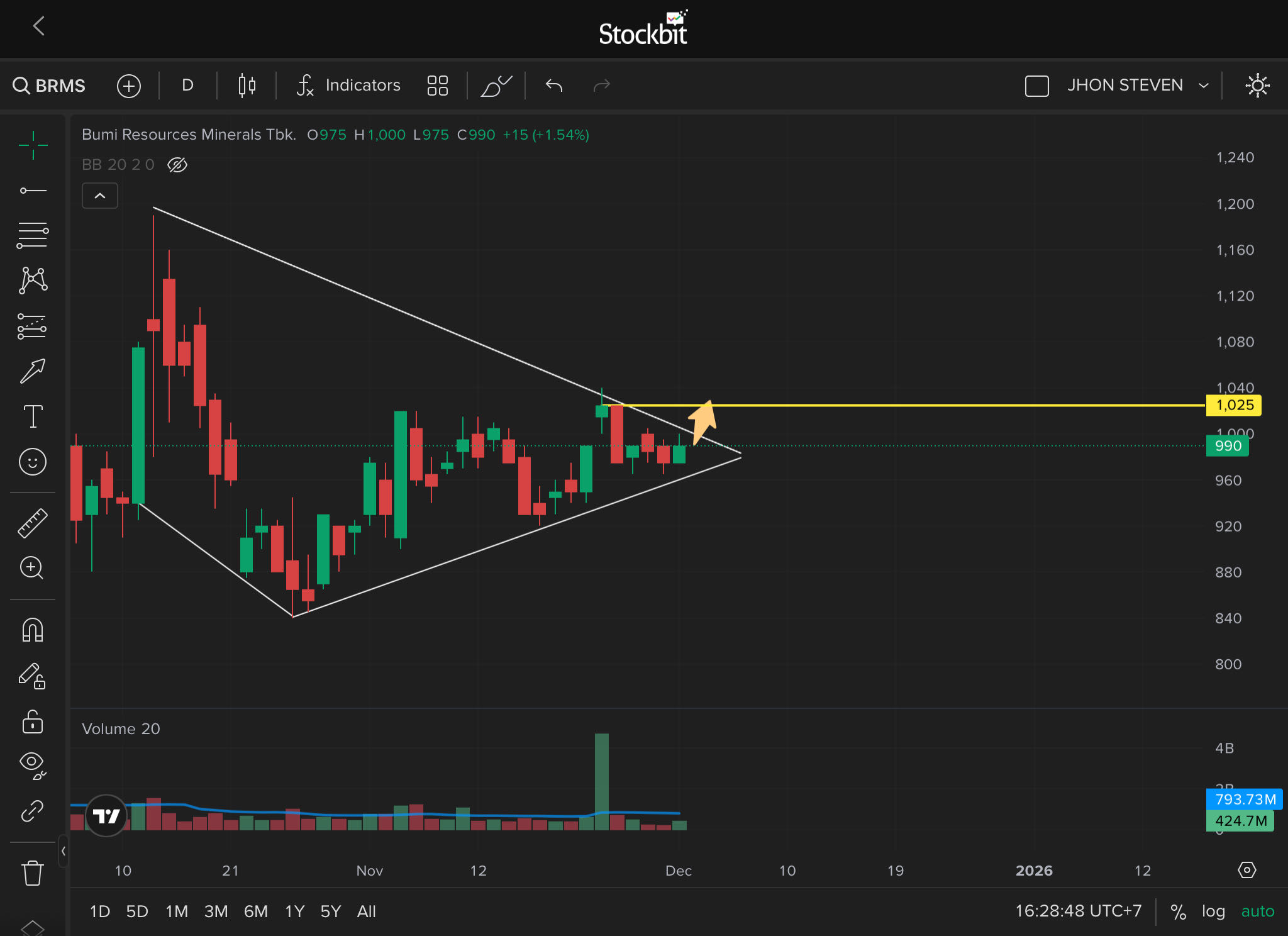 Pada grafik terlihat harga sempat menyentuh 1.000 sebagai level terendah, yang sekarang menjadi support kritis. Penutupan di 1.025 menunjukkan masih ada tekanan di sekitar level tersebut.