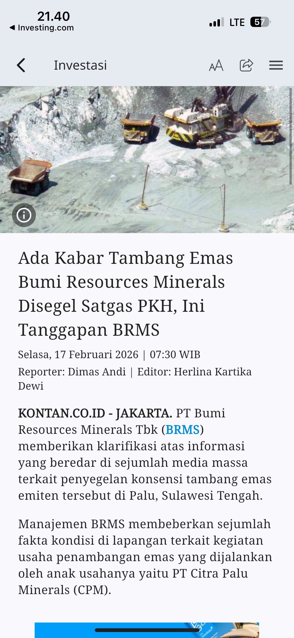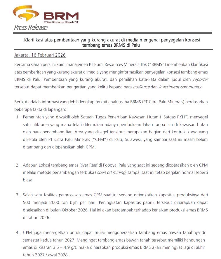 Manajemen PT Bumi Resources Minerals Tbk (BRMS) memberikan klarifikasi atas pemberitaan di sejumlah media yang menyebut konsesi tambang emas perseroan yang berlokasi di Palu disegel oleh Satuan Tugas Penertiban Kawasan Hutan (Satgas PKH) yang dikaitkan dengan kebijakan Presiden Prabowo Subianto.
