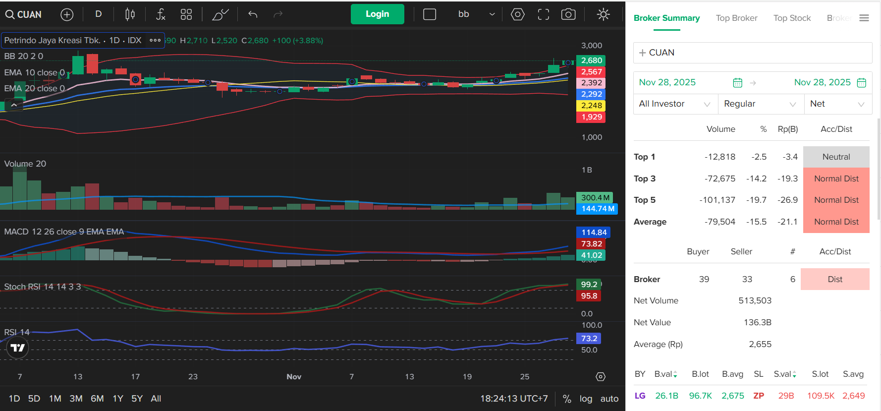 $CUAN naik ke 2.680 (+3.88%) namun tekanan jual mulai terlihat. Candle memang hijau, tetapi upper shadow cukup panjang menandakan seller masih kuat di area atas. MACD mulai mengarah ke atas namun belum konfirmasi golden cross. Stoch RSI sudah sangat tinggi (99), menandakan jenuh beli. RSI 73 juga mengindikasikan overbought.