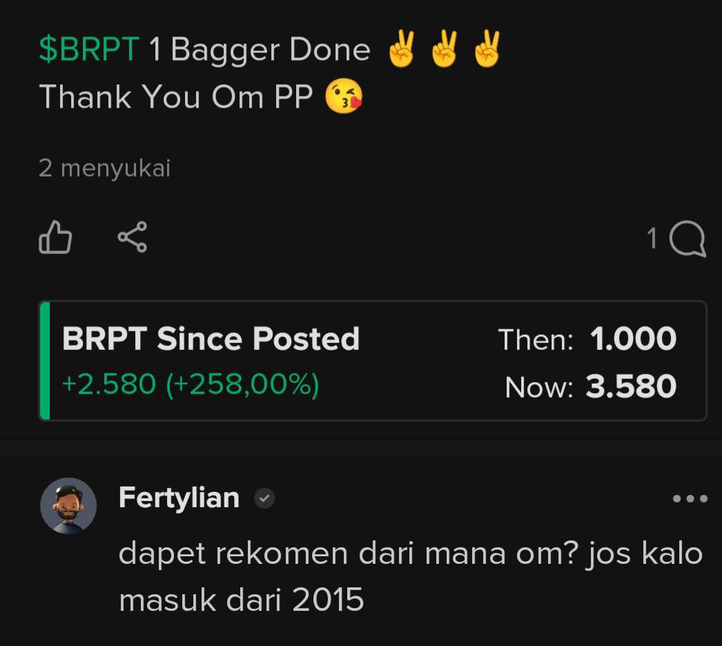 $BRPT BRO BRO KU. .sekedar mengingatkan . Andri hakim pernah berkata. kalau masih 1 universe. timpung saham pak pp yg blm naik . yah klo lu beli skrg masih worth it klo mau investasi . jgn lu masuk skrg trs untg 2% udh lu tp kocak.