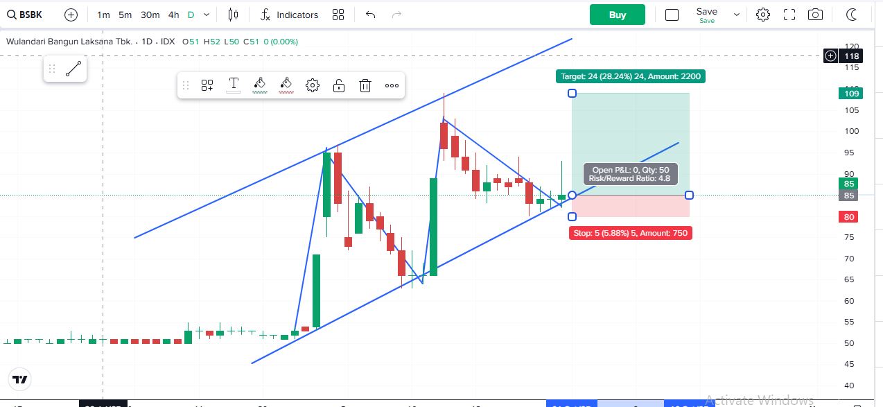 Rules entry & scaling in: Entry batch kecil konsolidasi, scaling up jika break out range di atas 75, batch tambahan hanya jika close harian di atas 74.