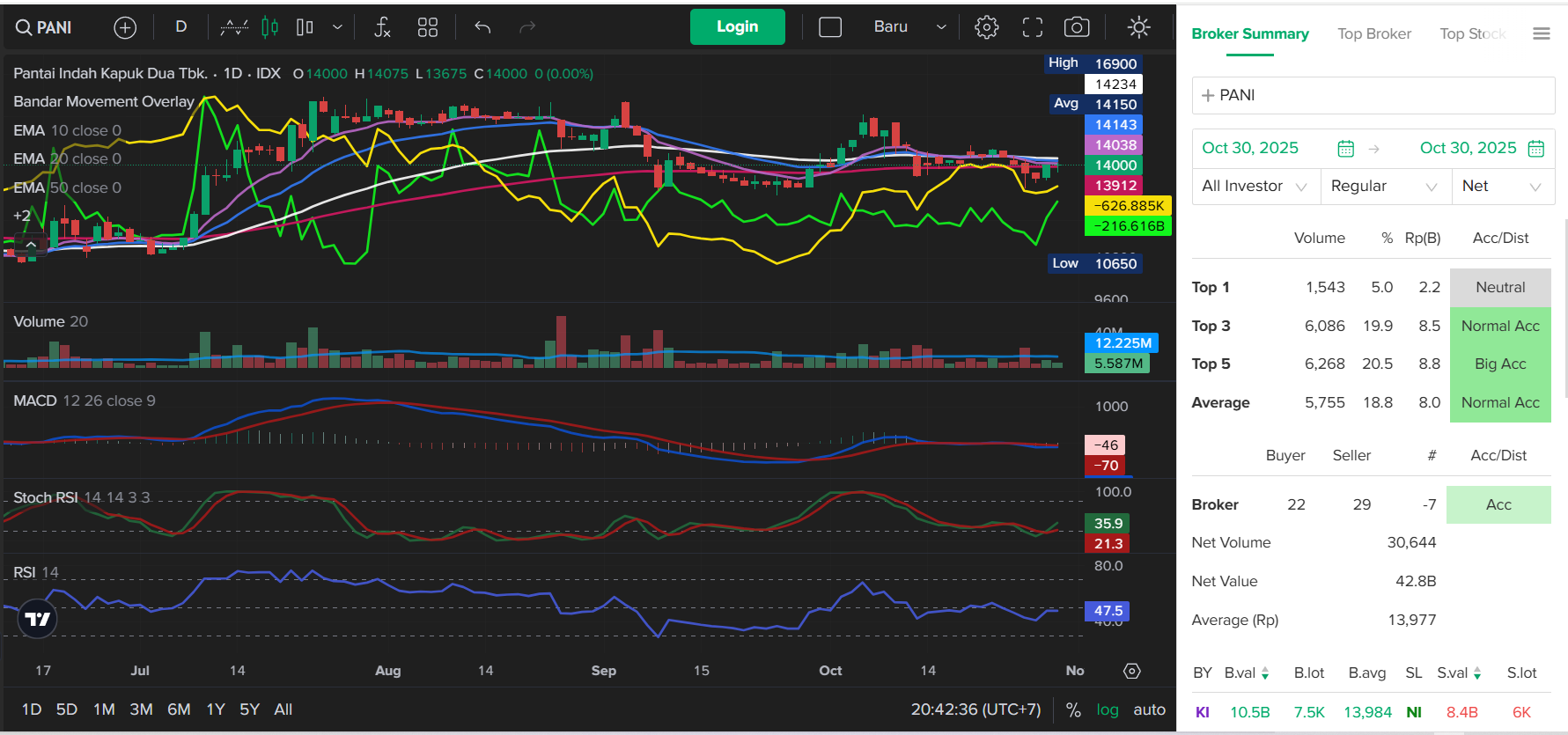 PANI ditutup flat di Rp14.000 dengan indikasi akumulasi normal oleh investor. Harga masih mencoba bertahan di atas area EMA 20 meski tekanan jual sempat muncul. MACD mulai mendekati area positif, sementara RSI 47,5 dan Stoch RSI naik menunjukkan potensi momentum teknikal untuk rebound jangka pendek jika support bertahan.