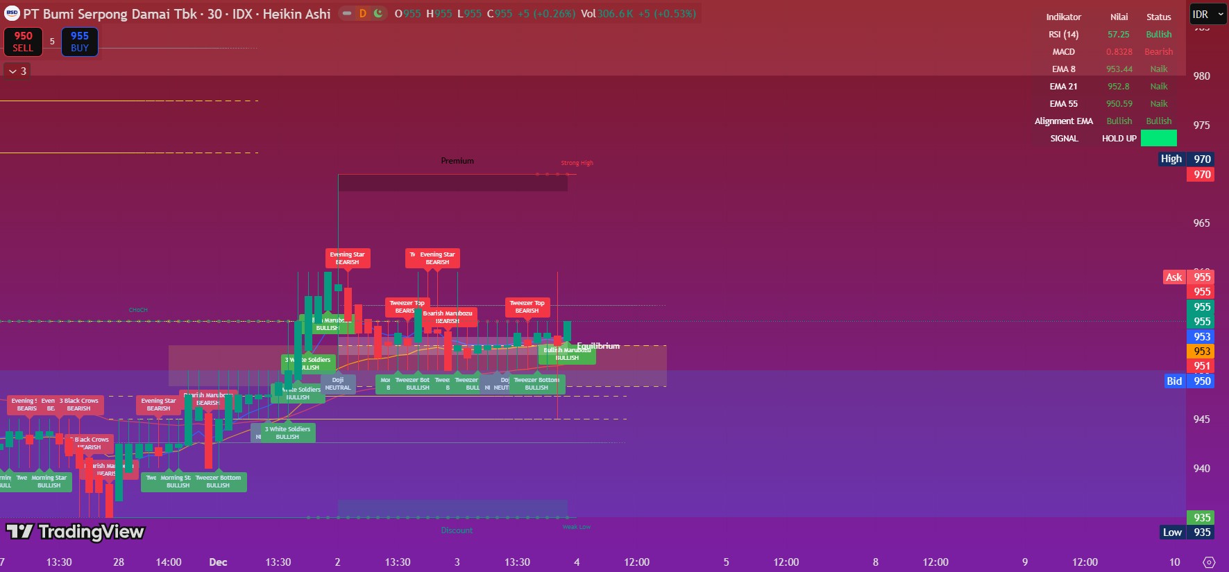 Harga saat ini bergerak sideways di atas EMA 55 (950.59), dengan momentum bullish masih terjaga: