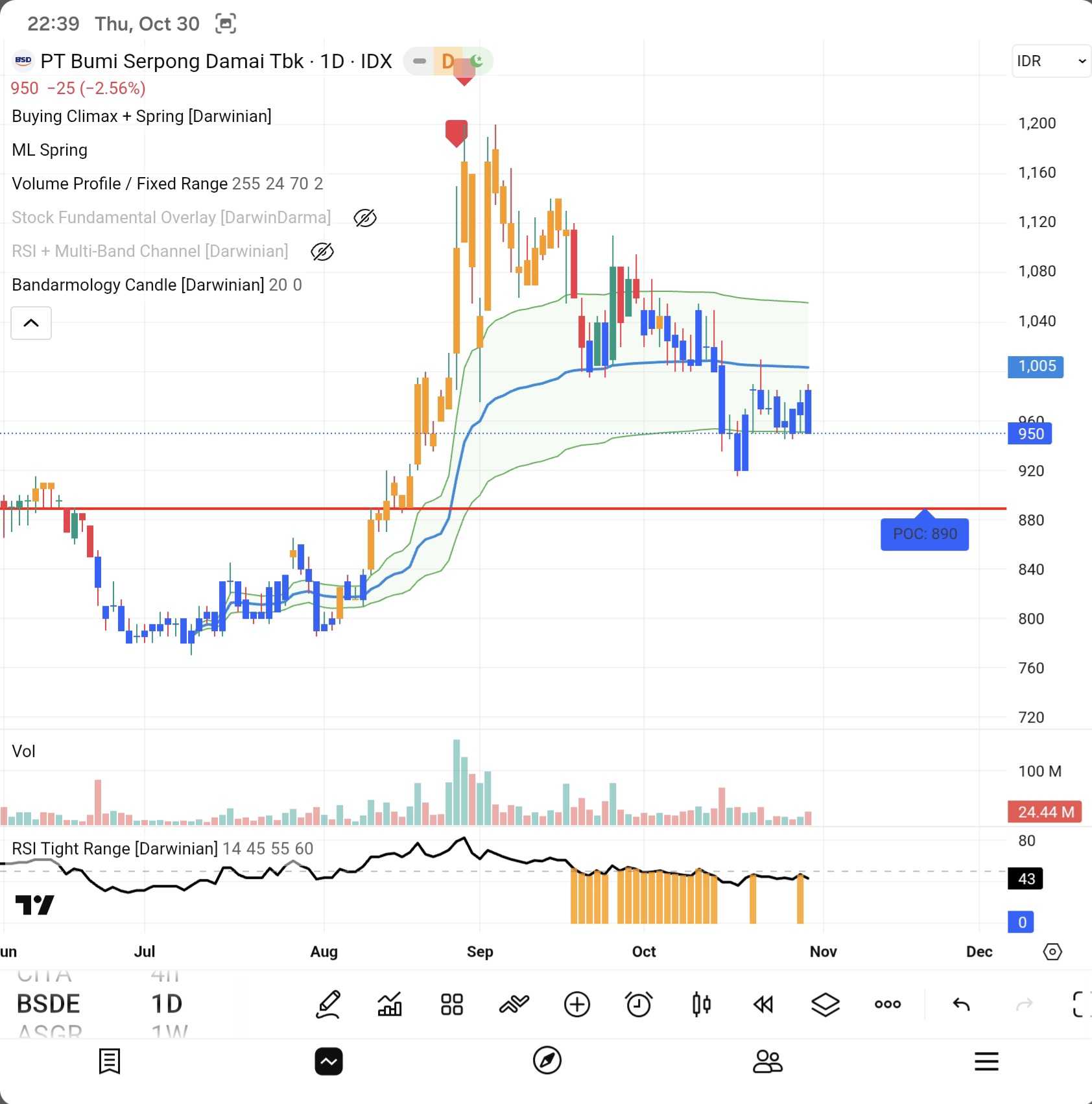 @yunusOfoldstone $BSDE beberapa candle terakhir bandar aktiv, harga tertahan oleh lower band VWAP, jika support ini bertahan dan VWAP mulai melandai (tidak turun), itu tanda akumulasi dimulai.. yang harus diperhatikan adalah arah trend sejak peak, masih turun teratur.. signal baik jika harga bisa crossover VWAP (sekarang di 1005)