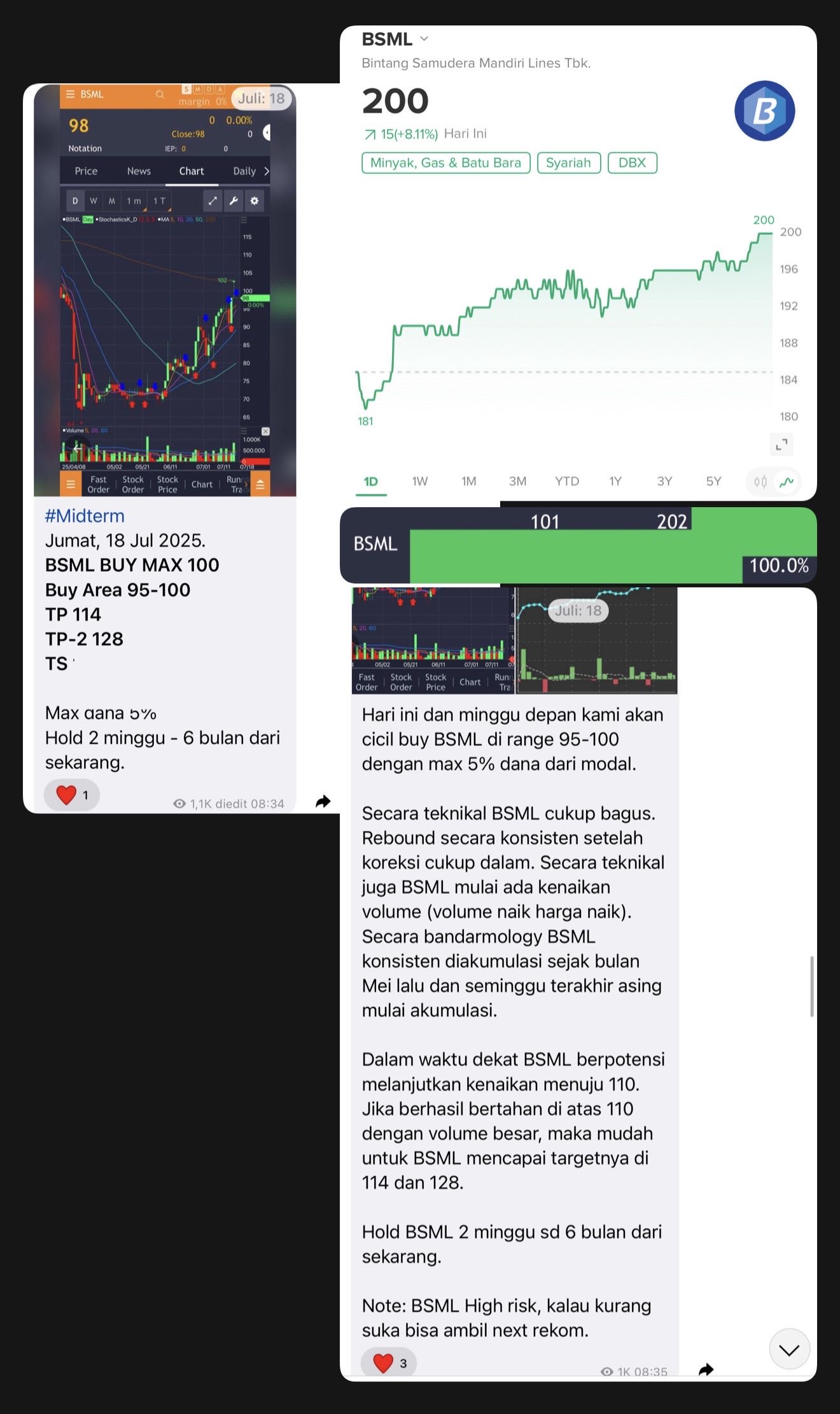 Pagi ini BSML kembali melanjutkan kenaikannya ke high 202 +9.19%. Naiknya BSML tentunya sangat menguntungkan bagi kami karena sekaligus mengantarkan pada cuan bagger +100%.
