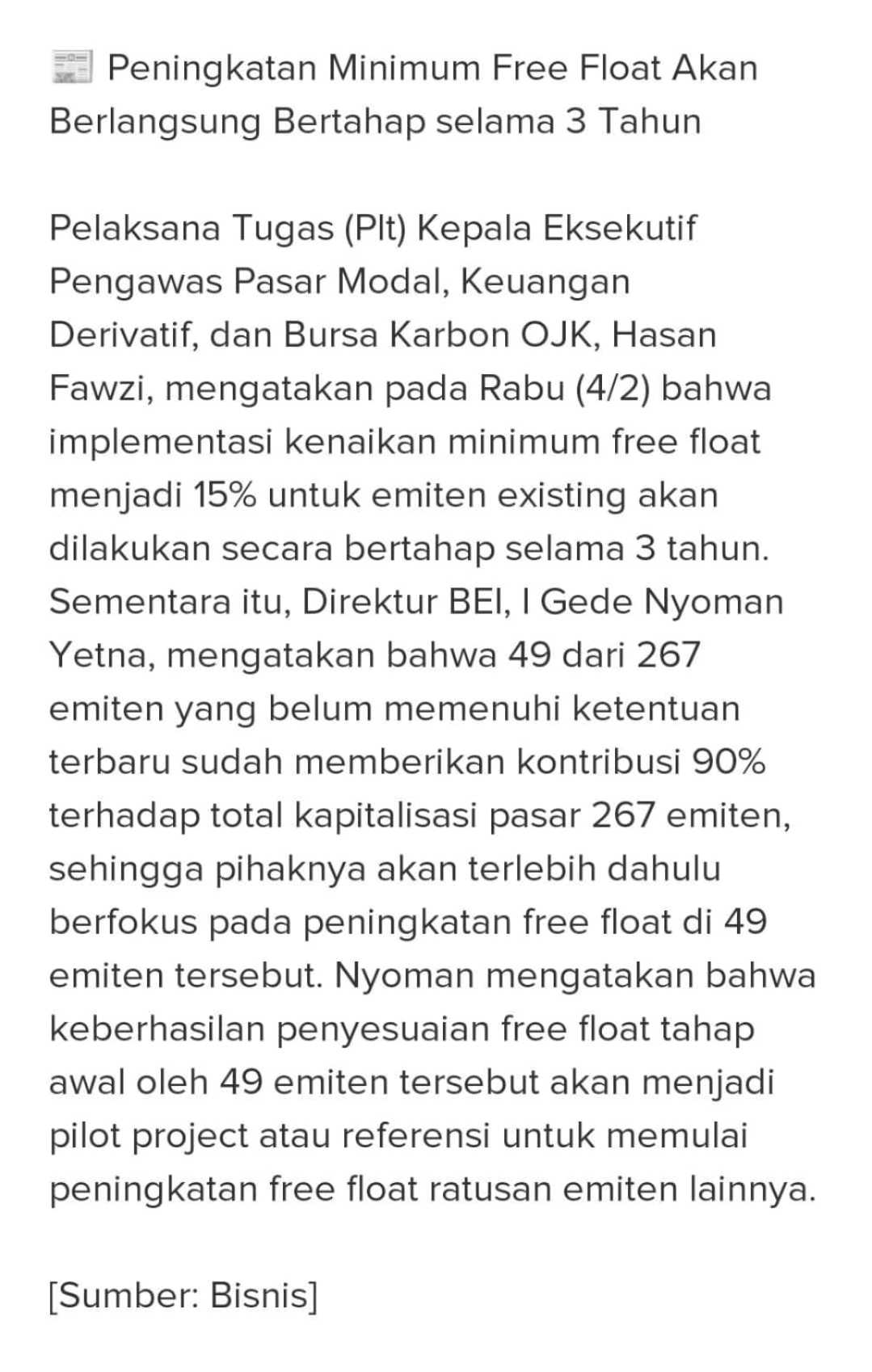 $BSSR asiiiiik BEI & OJK bakal merubah aturan free float dari 7,5% jadi 15%
