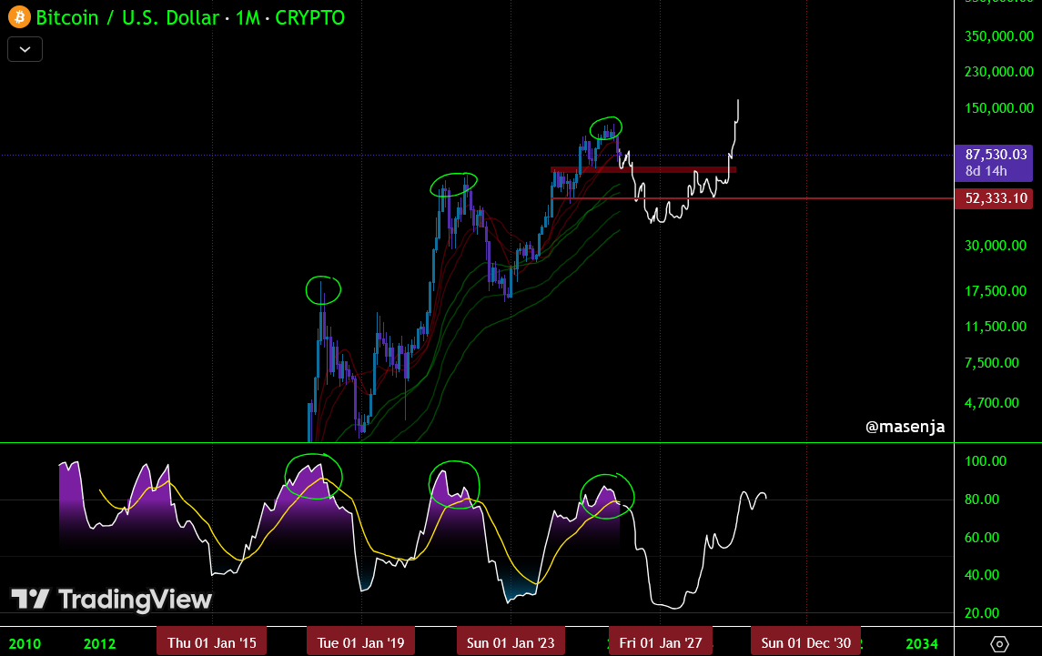 Ketika bull run saham indo sudah selesai. Lu ALL IN kan Bitcoin saat Januari 2027 di bottom 38k-42k (very high probability). Lalu lu tinggal hold aja selama 2-3 tahun kedepan sampe peak manianya di Q4 2029