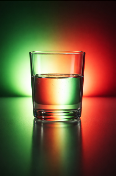 Pertama tama , mari kita coba melihat sebuah gelas bening yang memiliki air sebanyak setengah wadahnya.